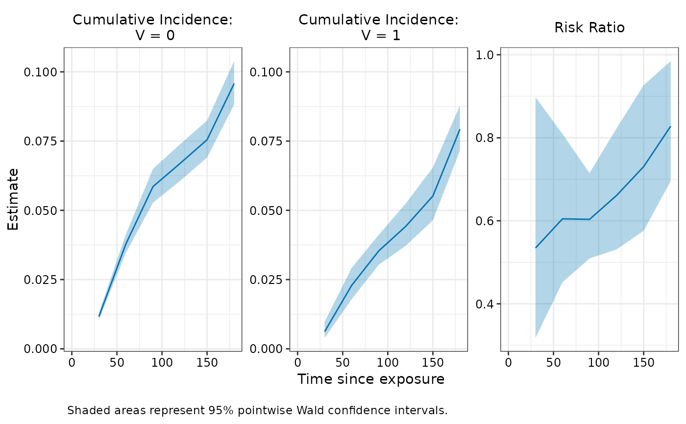 The two cumulative incidence panels share y-axis limits. The effect measure panel has its own independent y-axis scaling.